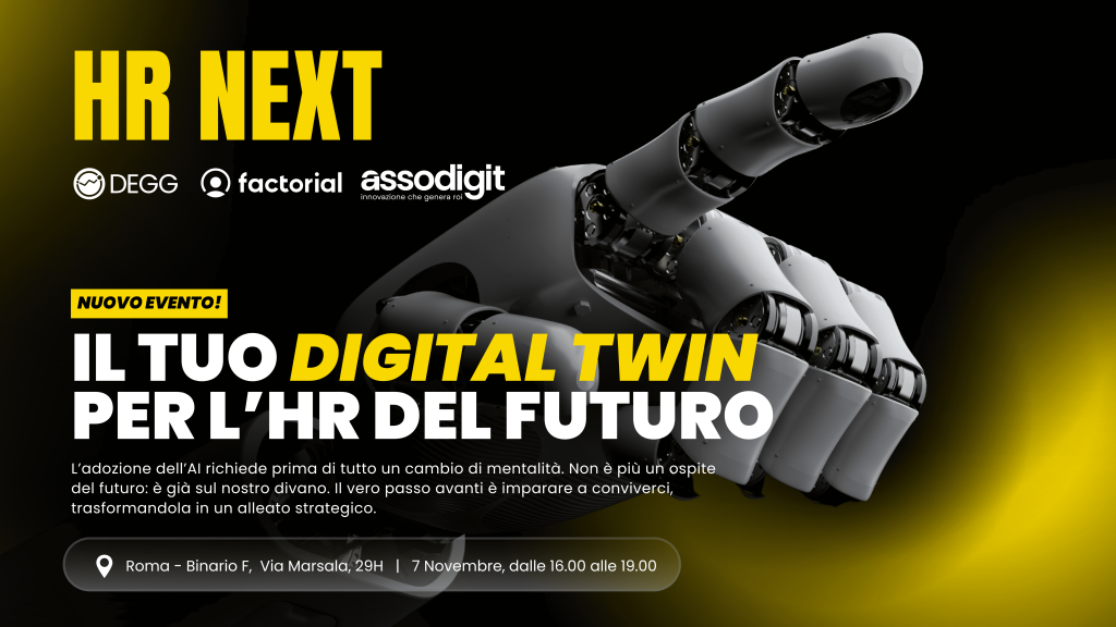 Il 7 novembre 2025, DEGG lancerà ufficialmente “HR NEXT: il tuo Digital Twin per l’HR del Futuro”, un evento dedicato alle aziende che vogliono comprendere come l’intelligenza artificiale possa accelerare la trasformazione digitale, migliorare la misurabilità dei processi e amplificare l’impatto sul business. La partecipazione è gratuita, previa registrazione.