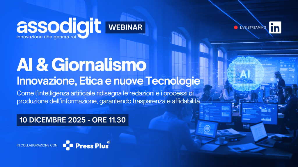 È da questa domanda che nasce “AI & Giornalismo”, il nuovo webinar promosso da Assodigit, in collaborazione con Dailymotion e Press Plus, che si terrà online su LinkedIn il 10 dicembre alle ore 11:30. L’incontro coinvolgerà giornalisti, editori, associazioni di categoria, aziende e istituzioni, con l’obiettivo di esplorare l’impatto reale dell’AI nel mondo dell’informazione, tra rischi, opportunità e nuovi modelli di collaborazione uomo-macchina.
